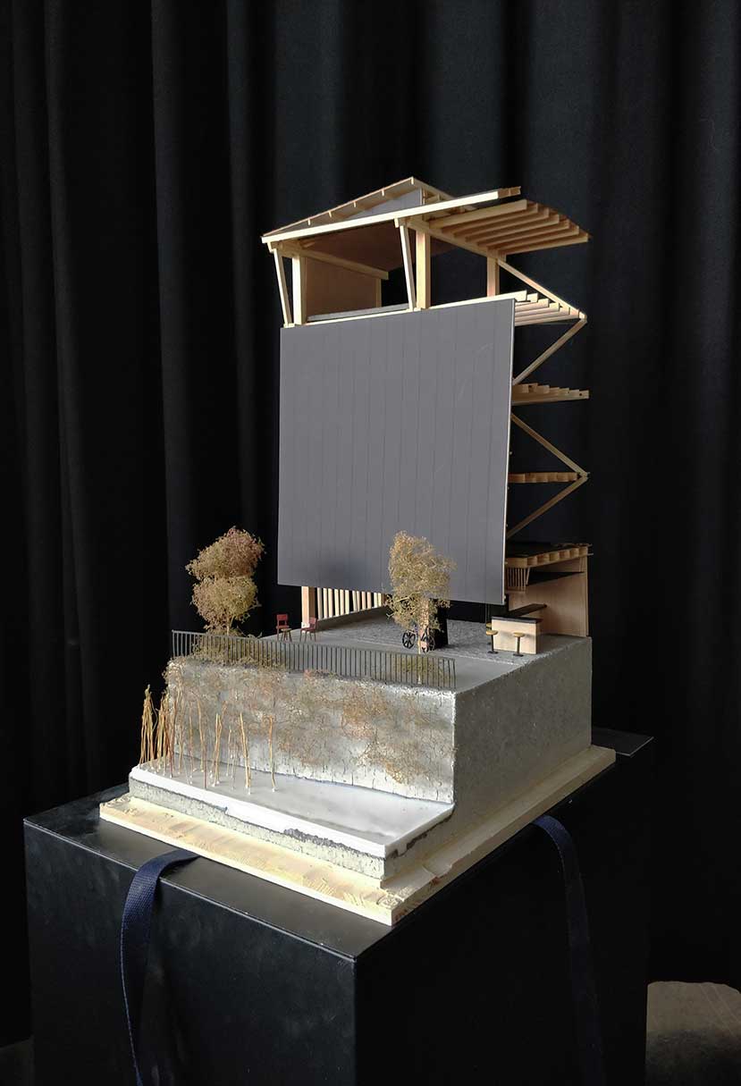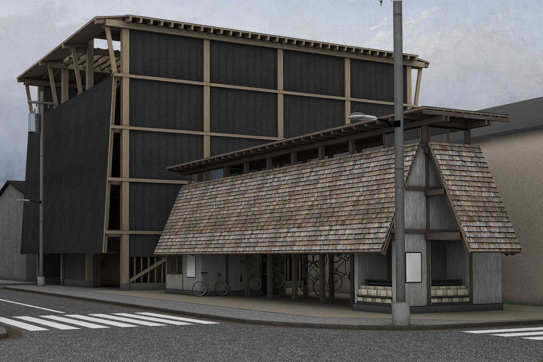 In einem Mischquartier in Niedrigbauweise der japanischen Stadt Kyoto ist ein Projekt angesiedelt, das aus einer langen Zusammenarbeit des Verfassers mit der dortigen Architekturfakultät entstand. Die für Kyoto wichtigen Gewässerräume, spezifisch die Freiflächen, die an einen durch das Quartier führenden Kanal grenzen, sind heute komplett versiegelt und werden als Parkplatz genutzt. Um diese ursprünglichen Freiräume vom Auto zu befreien, schlägt der Verfasser ein zentrales kommunales Parkhaus vor und aktiviert die dadurch freigewordenen Flächen als begrünte Aufenthaltsräume und zur Kühlung des Stadtklimas. Das Parkhaus in Holzbauweise kann später bei Bedarf zu Wohnungen transformiert werden. Ausserdem ergänzen ein Veloparking und ein Teehaus mit weiteren gemeinschaftlichen Nutzungen das Ensemble.
