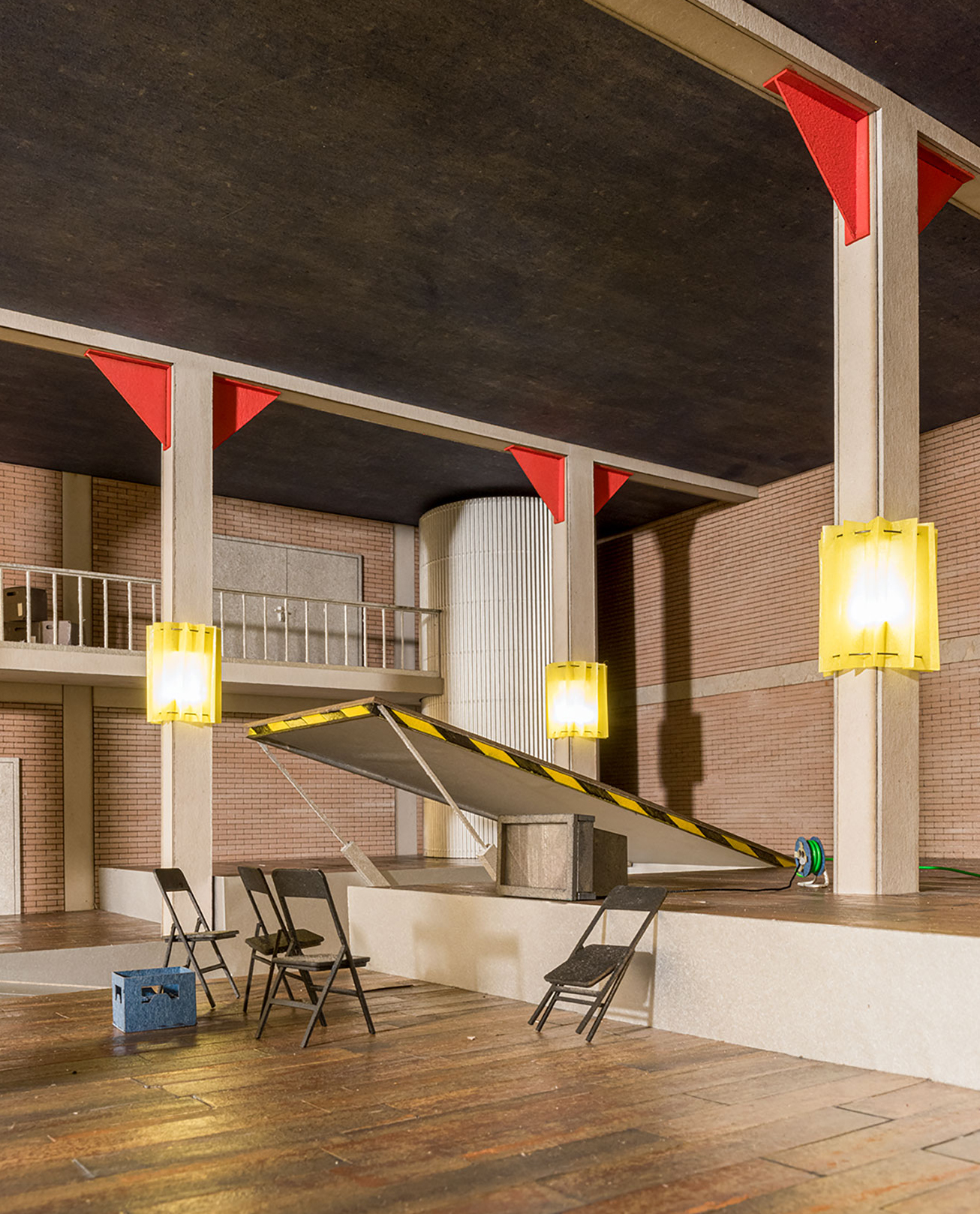 Das Erdgeschoss im Rifugio am Mont Grand widmet sich der Kastanienverarbeitung. So befindet sich unter dem Refugio der Umschlag der neuen Materialseilbahn, die die neue Bewirtschaftung des Kulturlands am Mont Grand sichern soll. Darüber, eingehängt in den ehemaligen Portalmasten, befindet sich das Refugio mit Gemeinschaftsraum, Küche und einfachen Schlafzellen als Rückzugsmöglichkeit.