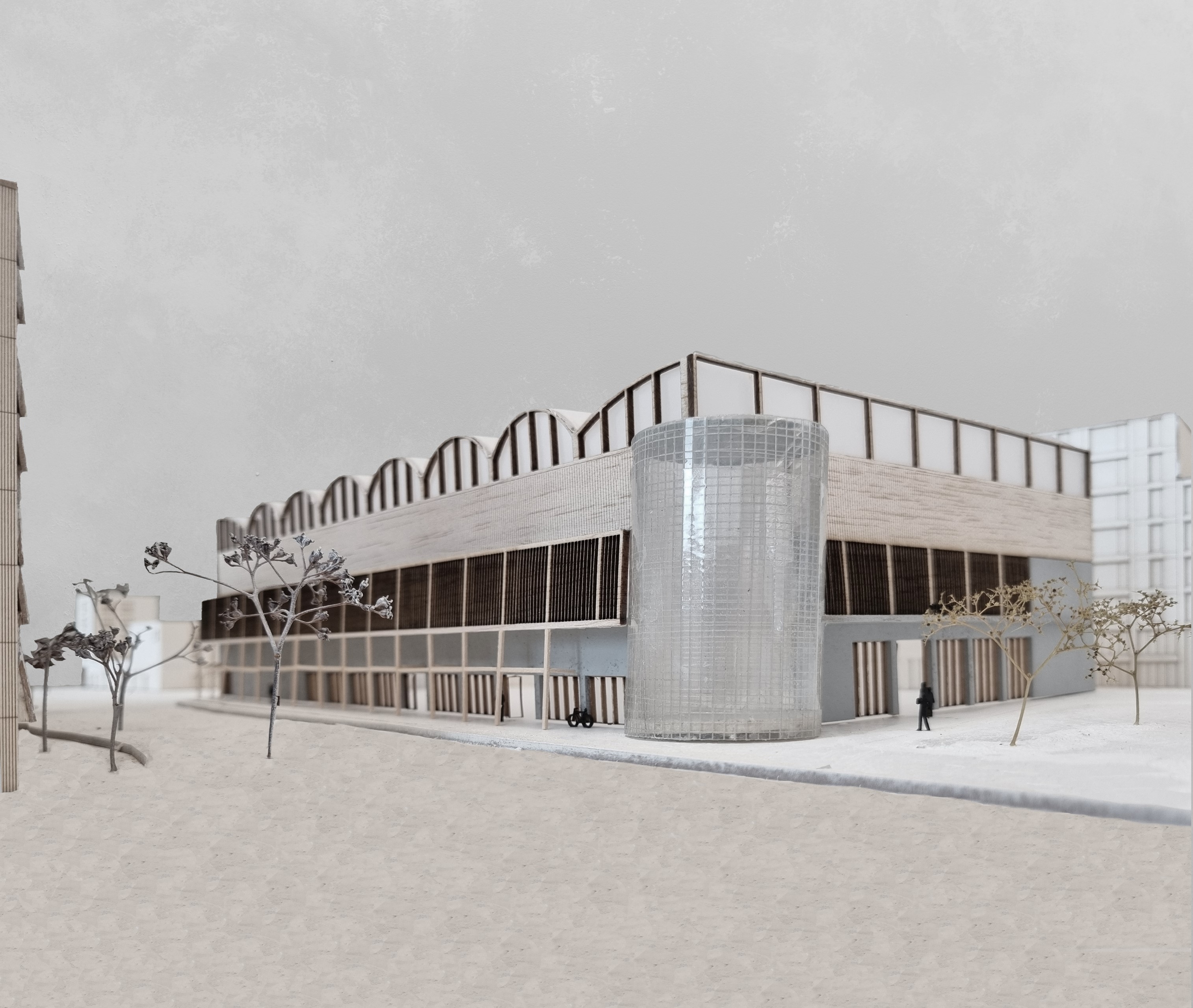 In der Peripherie von Neuenburg sollen bestehende Gewerbehallen umgenutzt werden. Der Standort in einem anonymen Industriegebiet neben der Autobahn ist eine Herausforderung. Der Verfasser schlägt vor, einen bestehenden Hallenkomplex um neue Elemente zu ergänzen und darin Wohnungen sowie Büros unterzubringen. Interessant ist die Idee, einen Veloweg als Langsamverkehrsachse durch die grossvolumigen Hallenbauten hindurchzuführen.