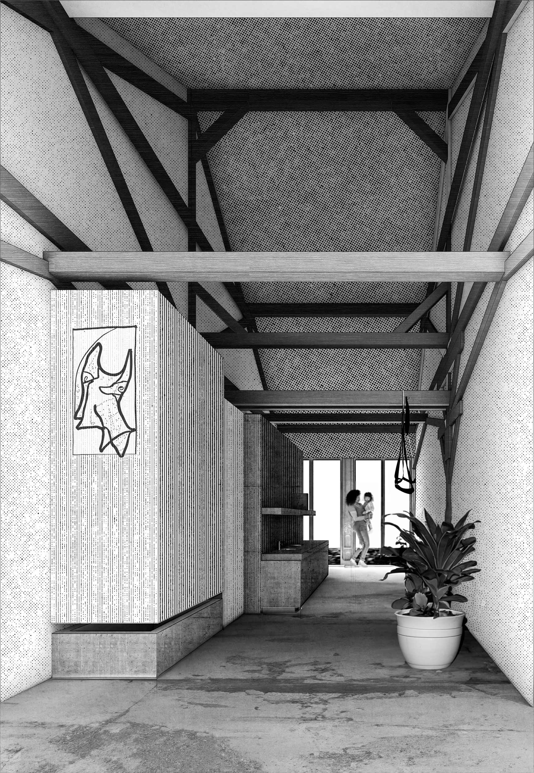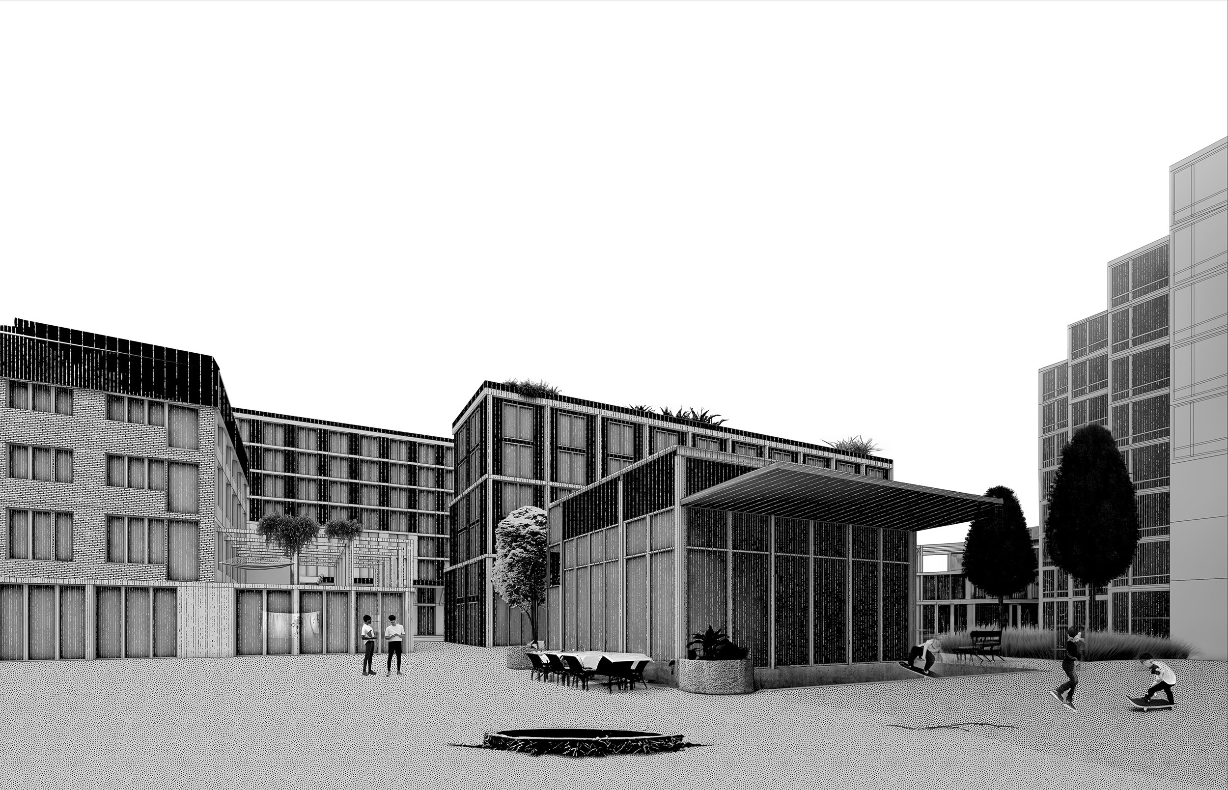 Das diesjährige Thesisseminar stand unter dem Titel «Keeping what’s good». Daraufhin stellte sich die Frage: Was ist gut? Was bietet die ehemalige Fabrik, die auf dem Areal konserviert werden muss? Was für eine Veränderung benötigt der Bestand, um auch in Zukunft bestehen zu können? Die Qualitäten, die erkannt wurden, befinden sich in der Heterogenität des gebauten. Die über einhundert Jahre addierten Gebäudekörper bilden ein abwechslungsreiches Konglomerat. Diese Reichhaltigkeit an Atmosphären im Aussen- und Innenraum sollten auf die neuen Gebäude projiziert werden. Der Bestand wird grösstenteils erhalten. Um mehr Licht und Luft an die Bestehenden Gebäude zu bringen, wird die Gebäudetiefe durch Entnahme gezielter Bereiche halbiert. So erhält das Bestehende neue Qualitäten und damit neues Leben.