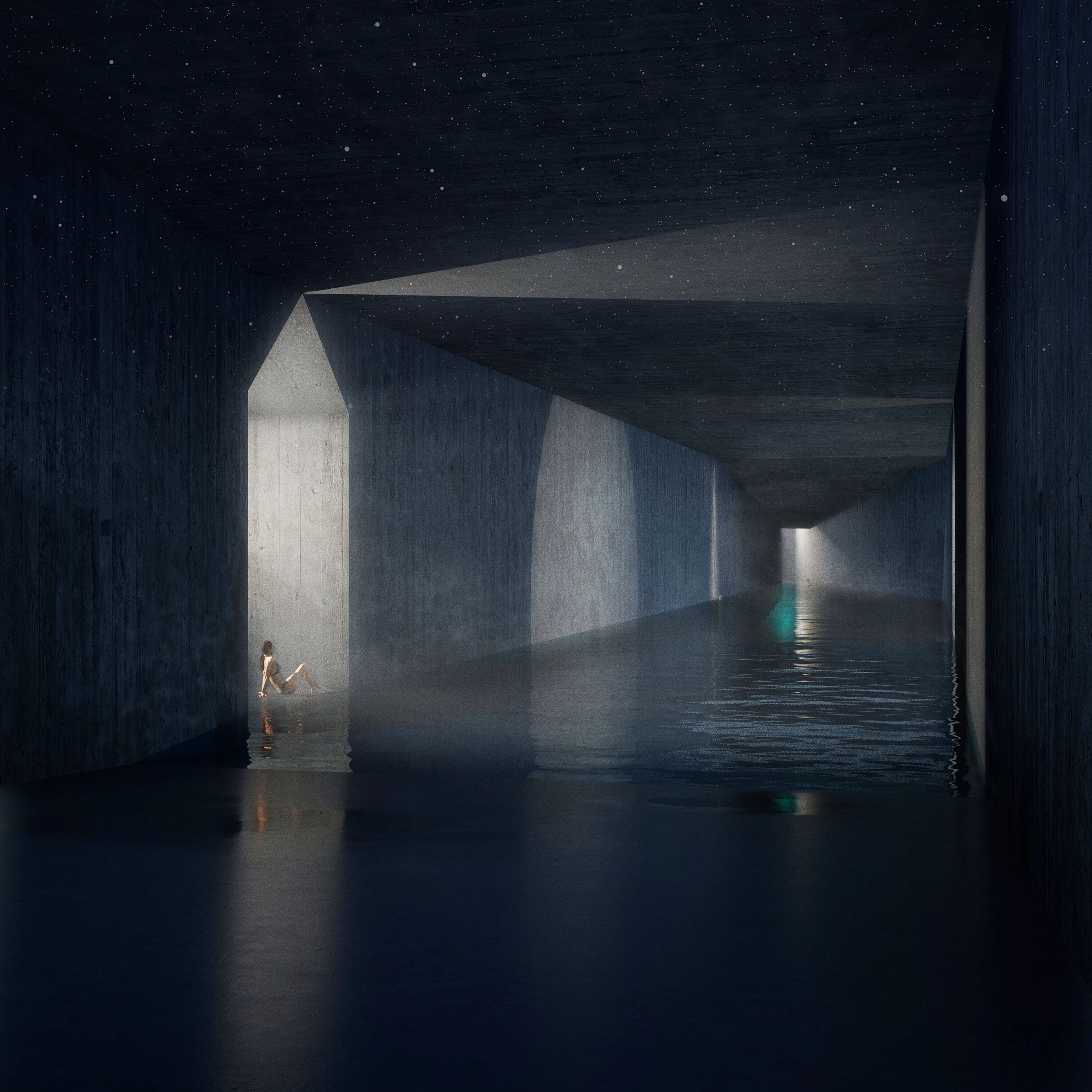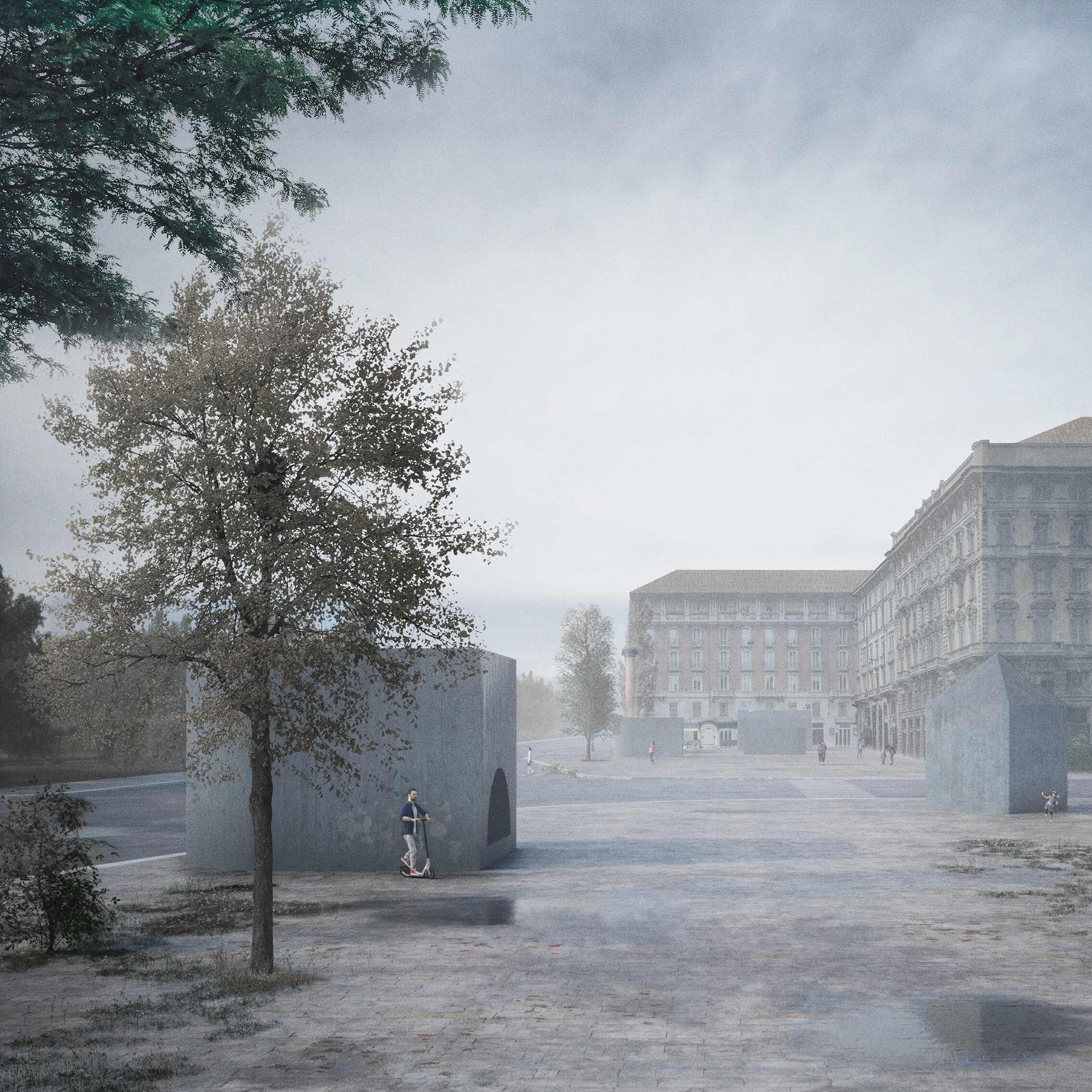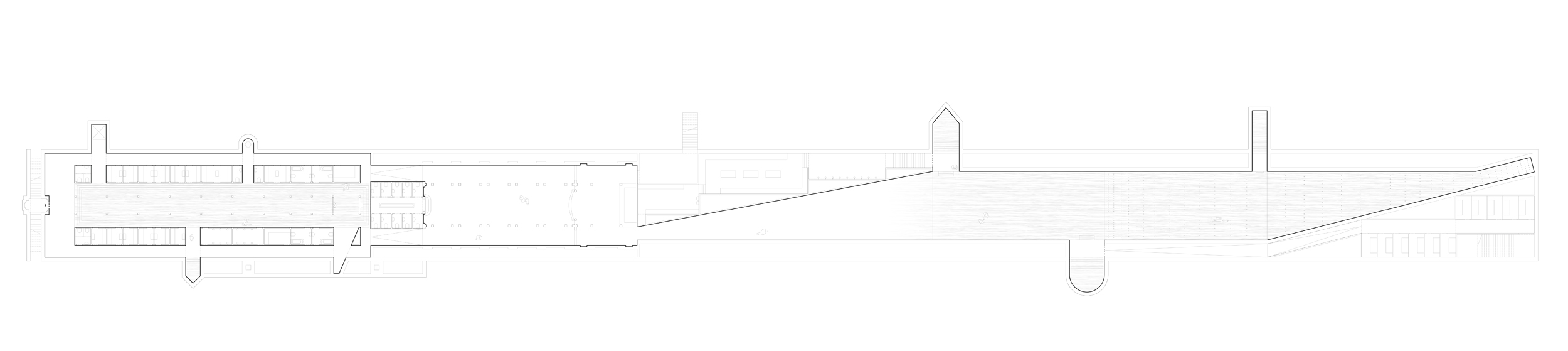 The project aims to restore the original function of the place, thanks to a long underground spa space characterized - as it was in the Diurno - by a central void and an occupied perimeter. Thus was born a place of light, well-being and, above all, contemplation. A laterally illuminated water space, whose mouths of light, in the square above, are transformed into sculptural elements that punctuate with small supporting functions an ideal urban space.