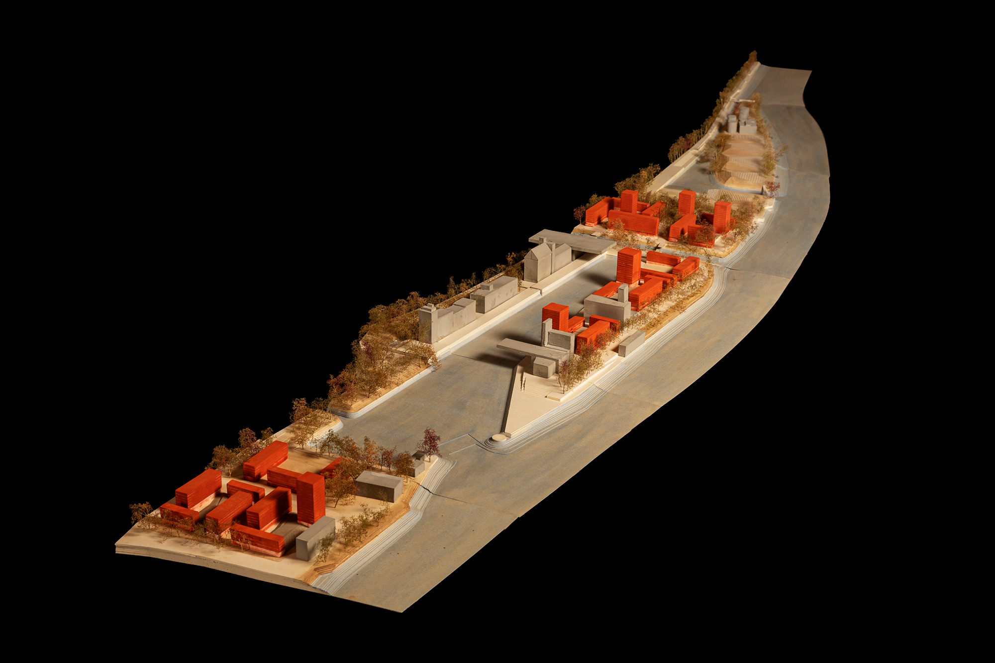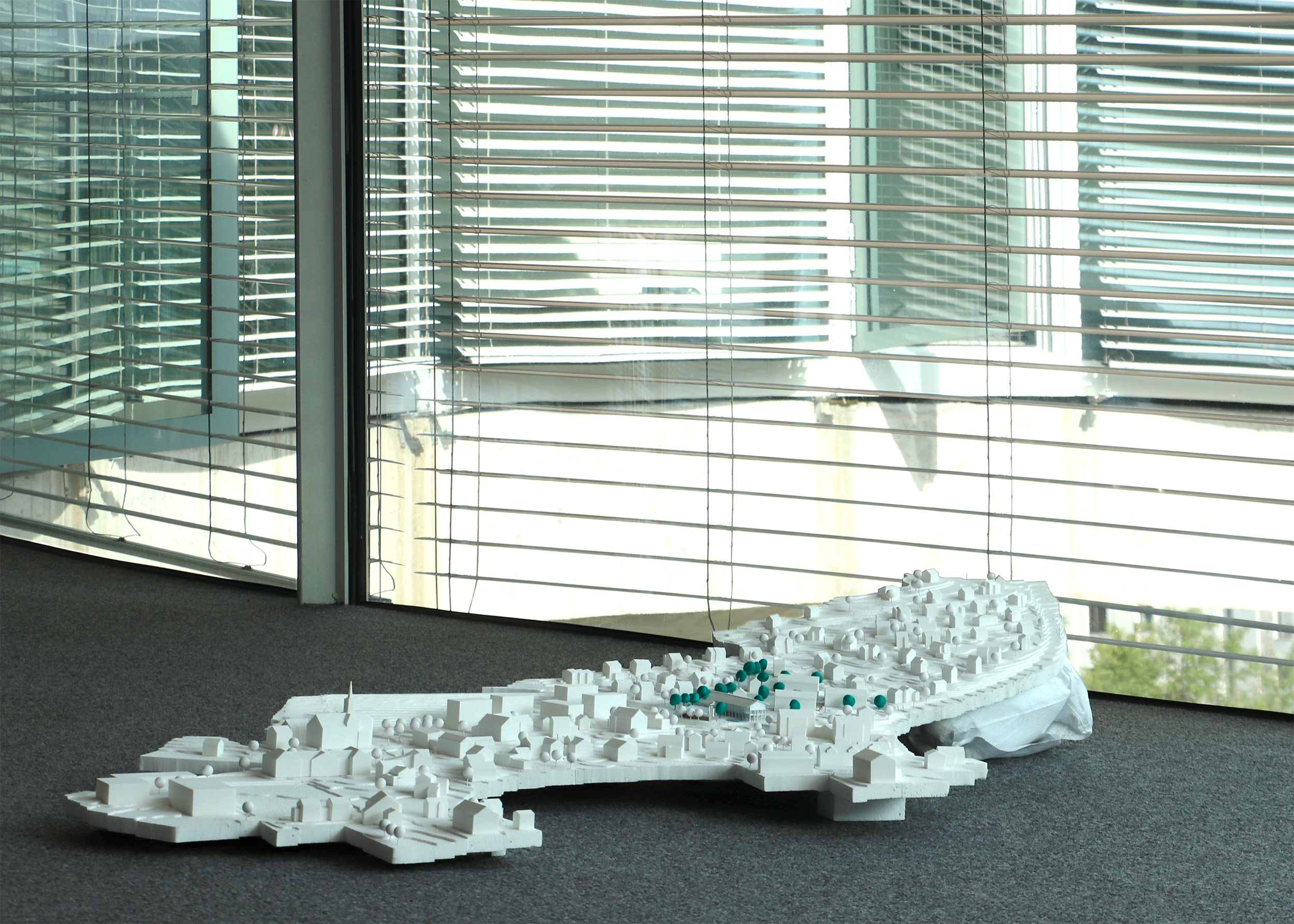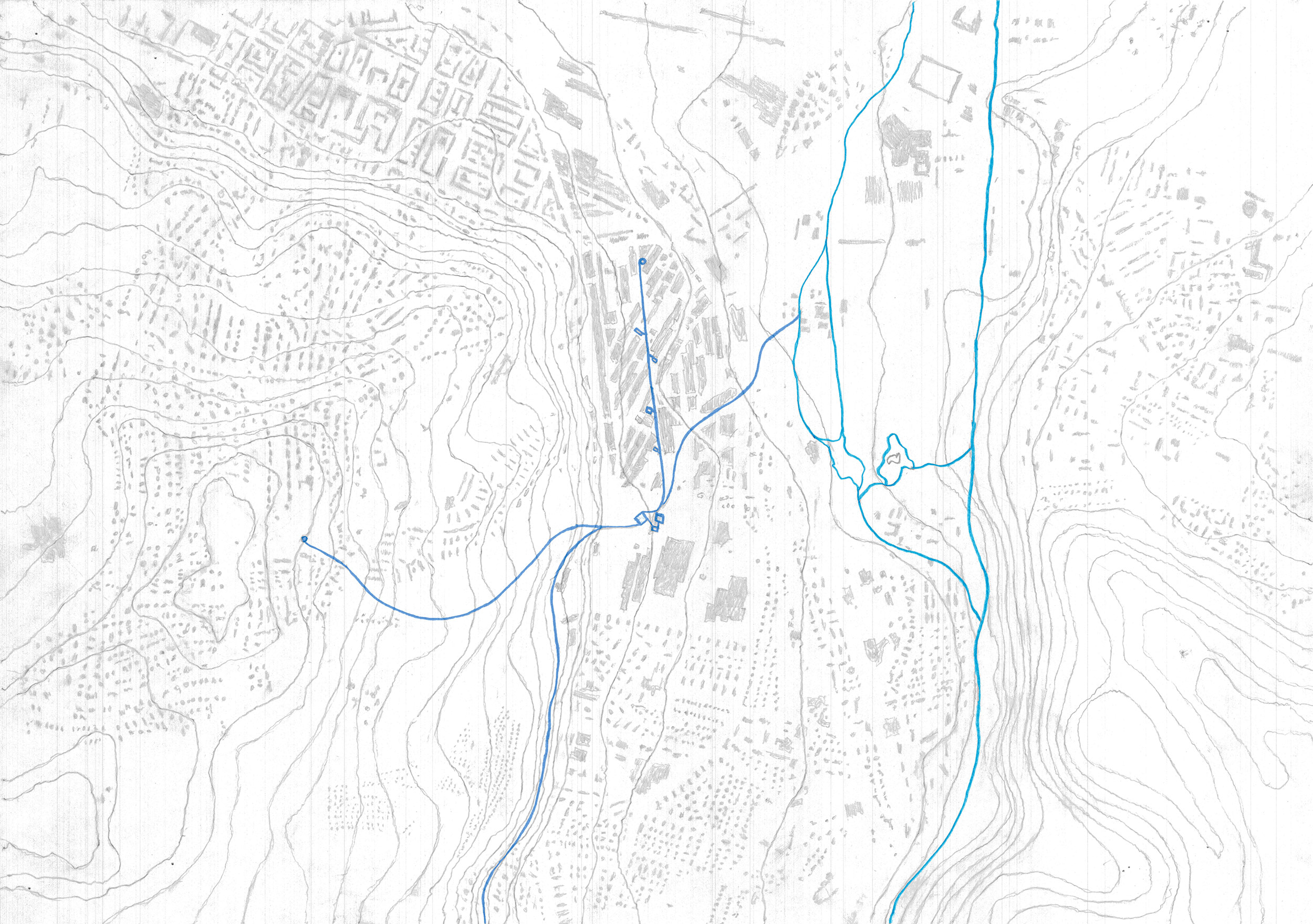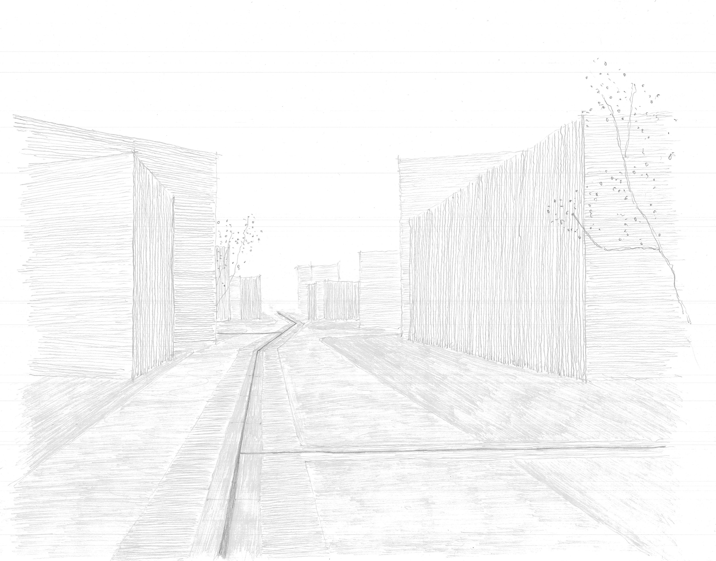 The project is an aqueduct running through Dreispitz; it cools down the district, whilst drawing a pavement along the way. It catches rainwater from the slope of the Bruderholz hill and from the existing water tower on top of it, channels it into the site. The water line flows into a pool and connects a system of fountains in pocket spaces along the Magistrale. It travels through a gutter in the ground, following the slope of the street, ending in the reservoir at the end of Frankfurt-Strasse. A new cistern, in the basement of an existing industrial building, controls the water flow; excess water is directed towards Merian Gardens, flowing into the Birs river. The pool is carved in the ground; long retaining walls draw a descending topography, where landscape is first hidden and then slowly revealed when a wall folds. In the absence of water, it becomes a space reminiscent of a theatre, where the window is the sky, and the city is forgotten. Walking up the bridge-aqueduct, the city becomes visible again.