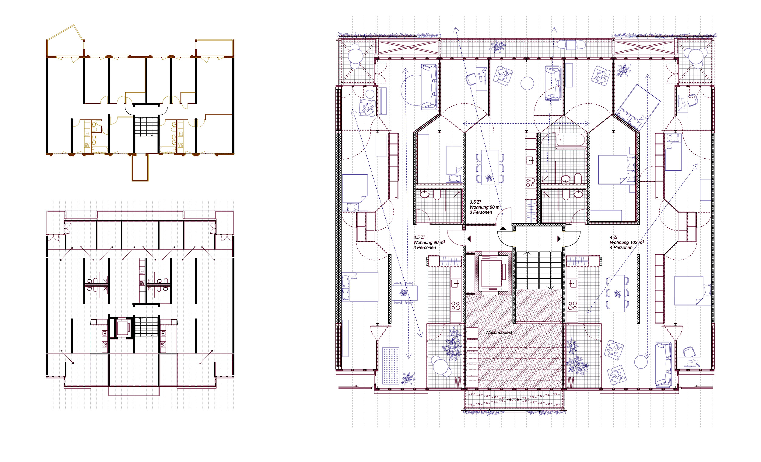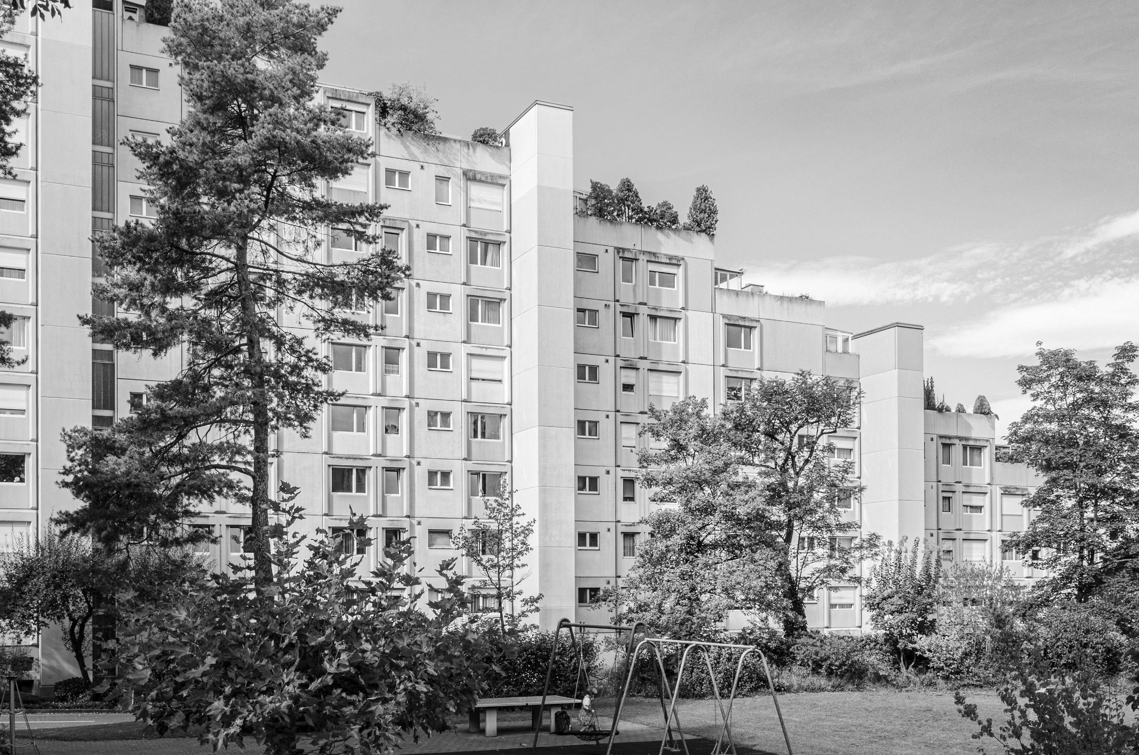 Um den Energieverbrauch im Gebäudesektor zu reduzieren und die aktuelle Wohnungsknappheit zu mildern, wird es immer wichtiger, sich mit den Sanierungen, insbesondere von Fassaden aus den 1960er und 1970er Jahren, zu beschäftigen. Das lineare Anbauen neuer Raumschichten über ganze Fassadenfluchten hinweg schafft neue Raumverbindungen und zeitgemässe Wohntypologien. Neben einer substanziellen energetischen Ertüchtigung entstehen mehr Wohneinheiten mit einer höheren Belegung und weniger Flächenverbrauch pro Kopf. Das klassische Baugerüst, das bei Fassadensanierungen als temporärer Arbeitsraum zum Einsatzkommt, wird zum gestalterischen Ausgangspunkt der eigentlichen Intervention. Der leichte Stahlskelettbau wird mit Windverbänden ausgekreuzt. Der gerüstartige Ausdruck strahlt eine gewisse Leichtigkeit aus und öffnet die Wohnungen zum Landschaftsraum.