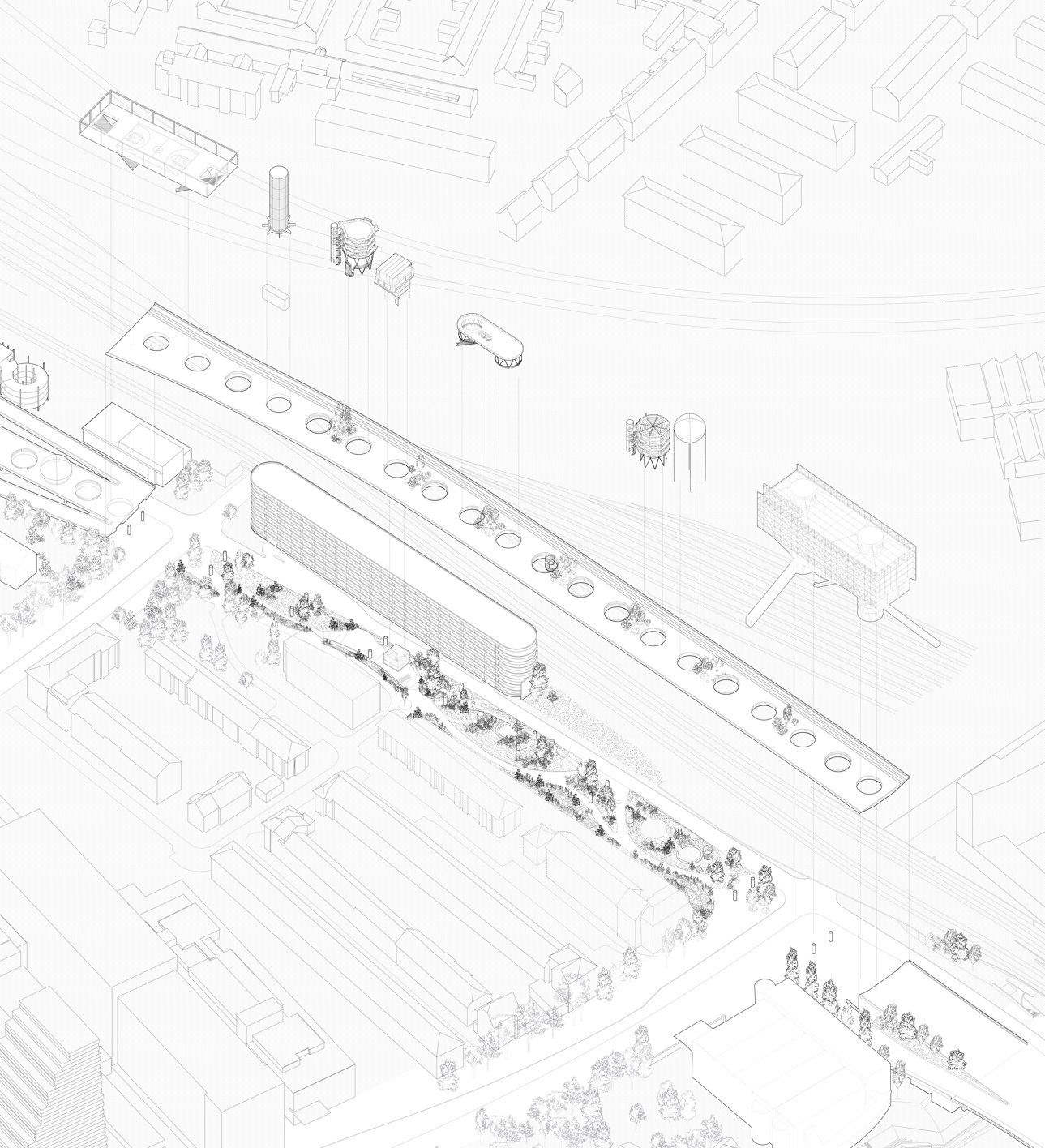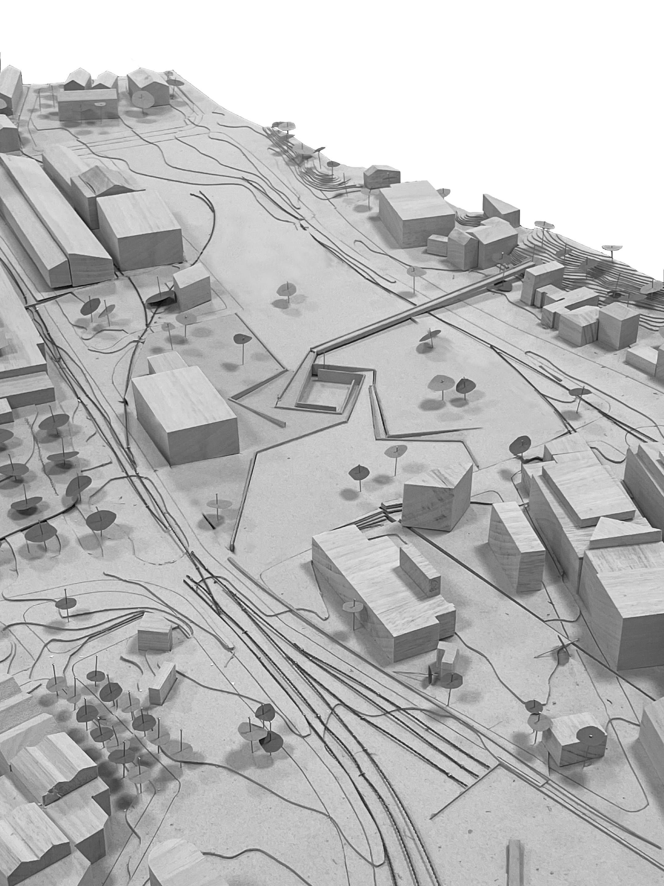 Highwaytopia emerges from the opportunity that the Grenzacherstrasse offers to rethink our perception of highway infrastructure. The Rheintunnel plan allows the decommissioning of a central Basel motorway, inspiring new uses for such milieus. By reducing travel speed, the highway becomes a multifunctional backbone with a tramline, bike path, and pedestrian strip. Subtracting some of the built substance of the highway’s concrete viaducts, which cast a strong shadow, is the genesis for a new type of landscape that rises from beneath the overpass. This new penumbra landscape is defined by the interplay between light and shadows. Small music follies set on the highway replace car noises with music of the community. This parade of follies reflects the ephemeral nature of parades, becoming the new scenography of the highway until future experiments arise from needs that are yet to be known. This research sought opportunities to repurpose underused infrastructure in the realm of the ugly and uncanny.