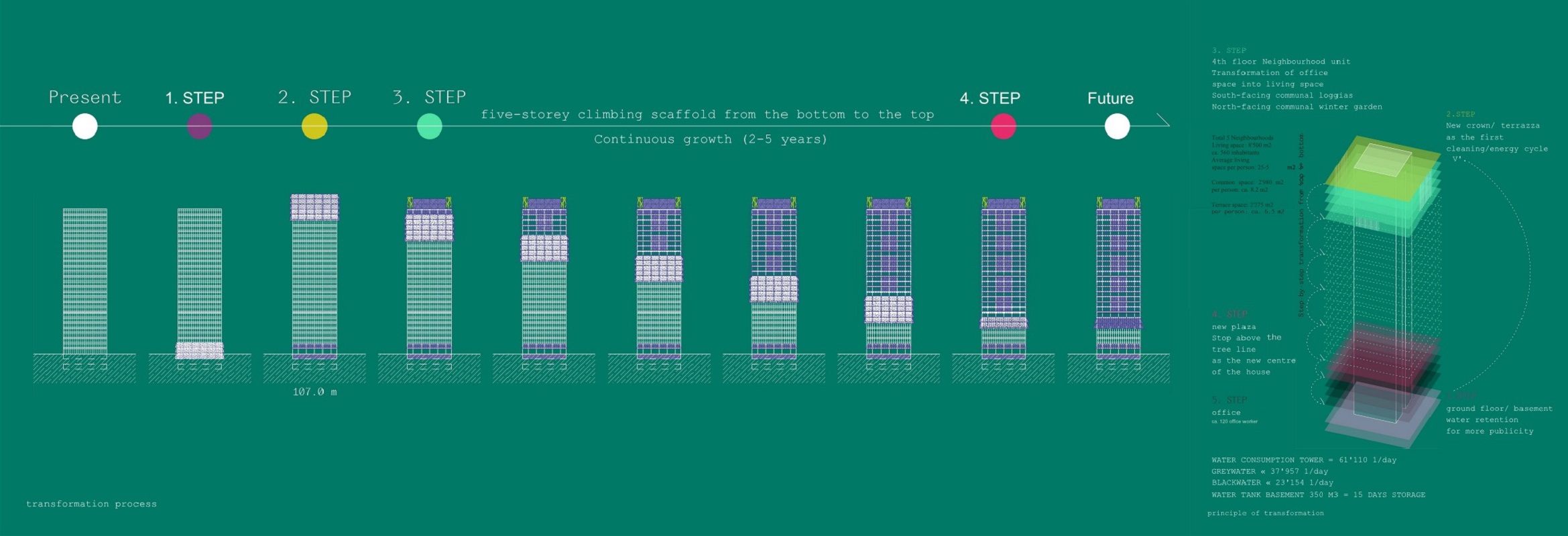 Basler Paradies is a housing co-operative offering approximately 150 double-height residential units, incorporating maisonettes, studios, flat-sharing cooperatives, townhouses, and family flats. Forming a block with shared balconies and terraces, the generous courtyard hosts communal areas such as a woodworking workshop, bicycle atelier, green house, and vegetable garden. Everyone has their own vision of paradise; the project provides the possibilities to build your own. A temple of columns, a structure in its pure sense; the building is based on a grid system, consisting of vertical and horizontal prefabricated elements. Full circle material recycling is envisioned; demolition, separation, production, and construction are all planned to be carried out on-site. Thanks to the structural redundancy of the elements, which allow an open, flexible floor plan design, this results in open, contemporary typologies that encourage further appropriation and adaptation.