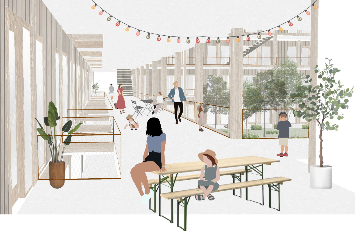 Le projet tisse un lien entre les différents quartiers, par la création de 3 pôles majeurs: un parc public qui s’étend le long de la Fonderie et qui constitue un apport de végétation important, la place de l’Industrie qui est tenue par la fin de Gordon-Benett et du nouveau projet ainsi que les cours intérieurs des îlots ouverts, intériorités majeures pour les habitants. Le projet propose une utilisation innovante des vides urbains. Deux bâtiments sont réutilisés: le premier celui de la Fonderie, change totalement d’affectation pour devenir un centre de loisirs. Les activités proposées ne nécessitent pas d’isoler le bâtiment. Le deuxième bâtiment, celui des garages, propose une surélévation de logements. Cette surélévation est possible grâce au renfort de l’existant avec un système de poteaux-poutres en bois et métal ainsi qu’un étage technique servant de dalle de répartition. En somme, ce processus met en lumière d’une part le patrimoine bâti comme étant une base solide de projet, et de l’autre une utilisation des matériaux nobles et réfléchie afin de créer un tout cohérent. Le Projet propose de rehausser, transformer ou réaffecter les structures existantes plutôt que de construire de nouveaux bâtiments énergivores. Ce choix démontre une compréhension approfondie de l'importance du réemploi des structures et des matériaux existants, en contribuant à réduire l'empreinte écologique du projet. Prise en compte des enjeux environnementaux et sociaux. Parmi les différents travaux effectués sur le site, ce projet se distingue par son attention particulière aux enjeux environnementaux et sociaux, ainsi qu'aux besoins des usagers. En conclusion, le projet sur le « Quartier de la Fonderie, Réhabilitation de la zone industrielle du Lignon » incarne une réponse éclairée et innovante aux défis contemporains de l'urbanisme.