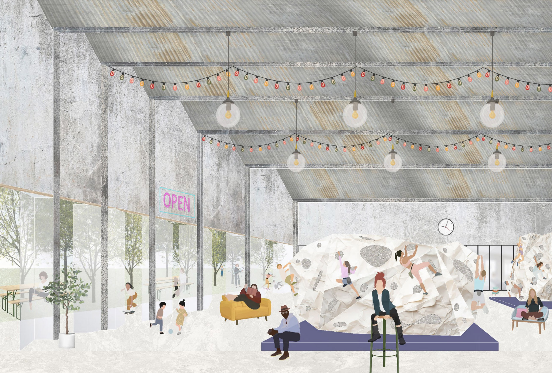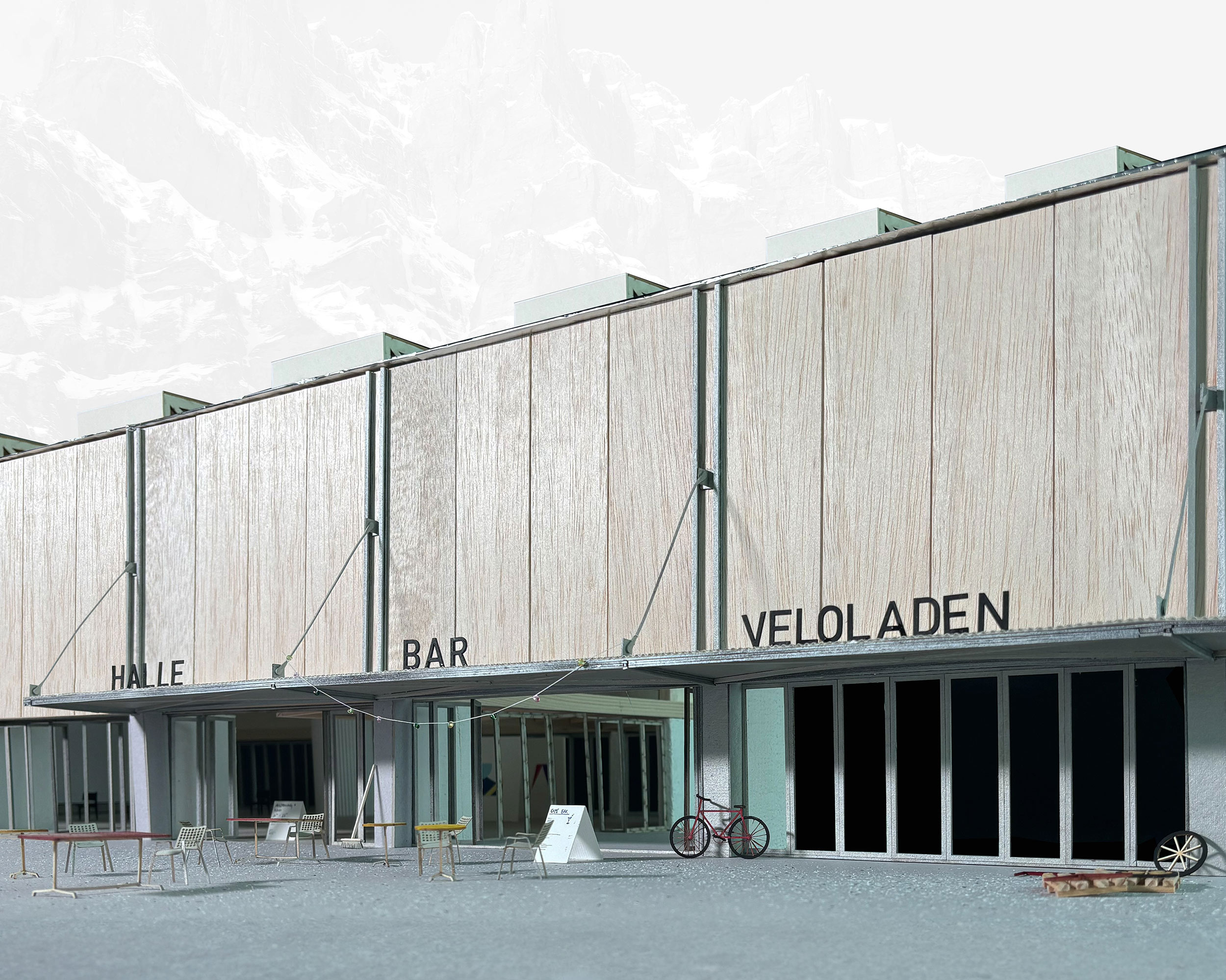 Das Rathaus von Leukerbad soll transformiert werden. Ausgehend vom Tourismusmodell der Gemeinde rund um Gesundheit, Natur und Erlebnis und aufgrund einer umfassenden Analyse der demographischen und wirtschaftlichen Rahmenbedingungen wird eine Velostadt mit vielfältigen Nutzungen und neuen Arbeitsplätzen in Veloproduktion und -forschung vorgeschlagen. Die wesentlichen städtebaulichen Eingriffe leiten sich aus den schlechten baulichen und konstruktiven Qualitäten des Bestandes ab. Dabei wird ein Grossteil der erdgeschossigen Volumina entfernt und durch räumlich aufgewertete Freiflächen sowie eine grosszügige Hallenkonstruktion ersetzt. Durch die flexible Teilbarkeit ergeben sich zusätzliche Möglichkeiten für sportliche oder andere kulturelle Veranstaltungen. Zusammen mit den frei bespielbaren Aussenräumen hat der neue Gebäudekomplex das Potenzial, zum neuen Treffpunkt von Leukerbad zu werden.
