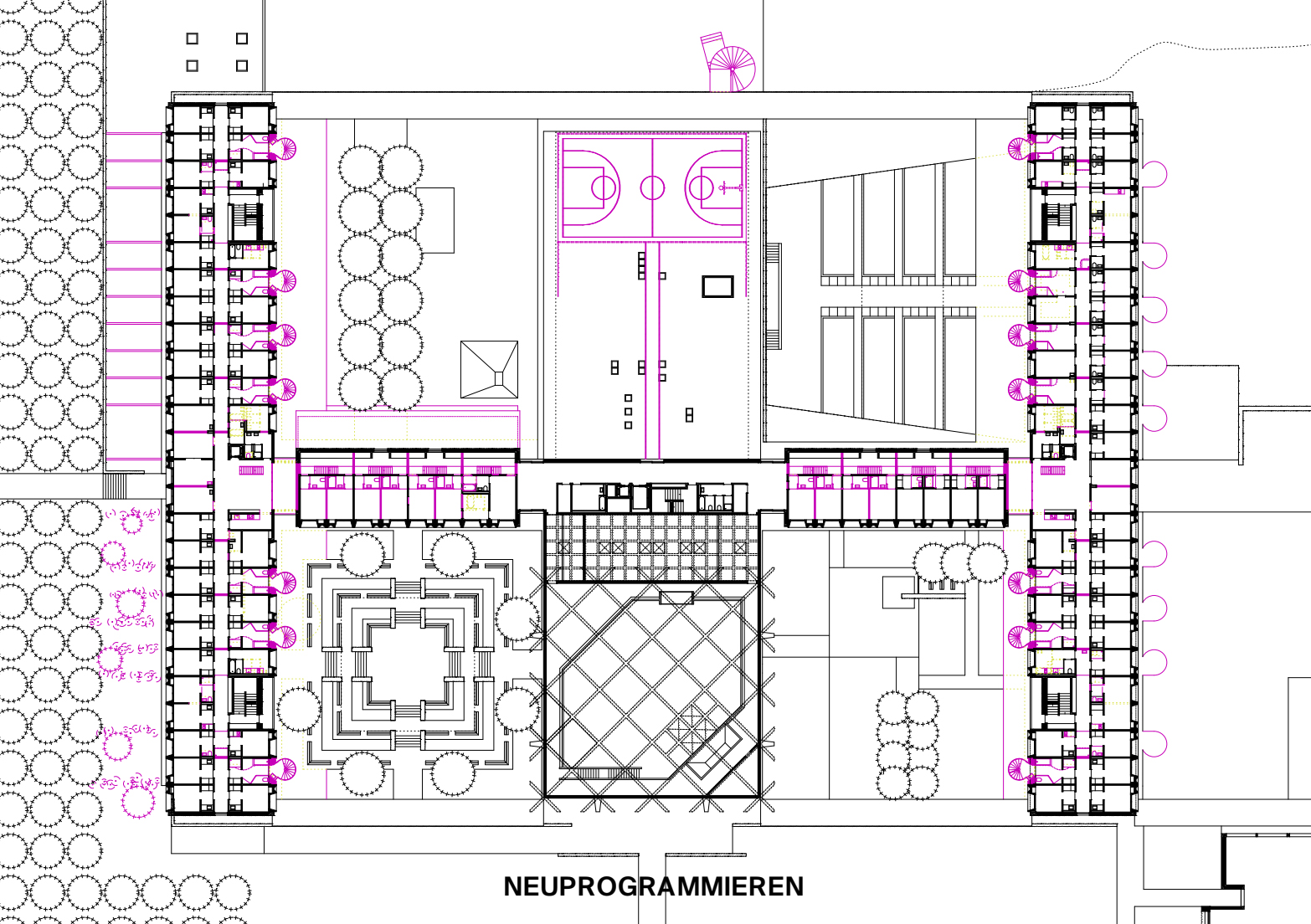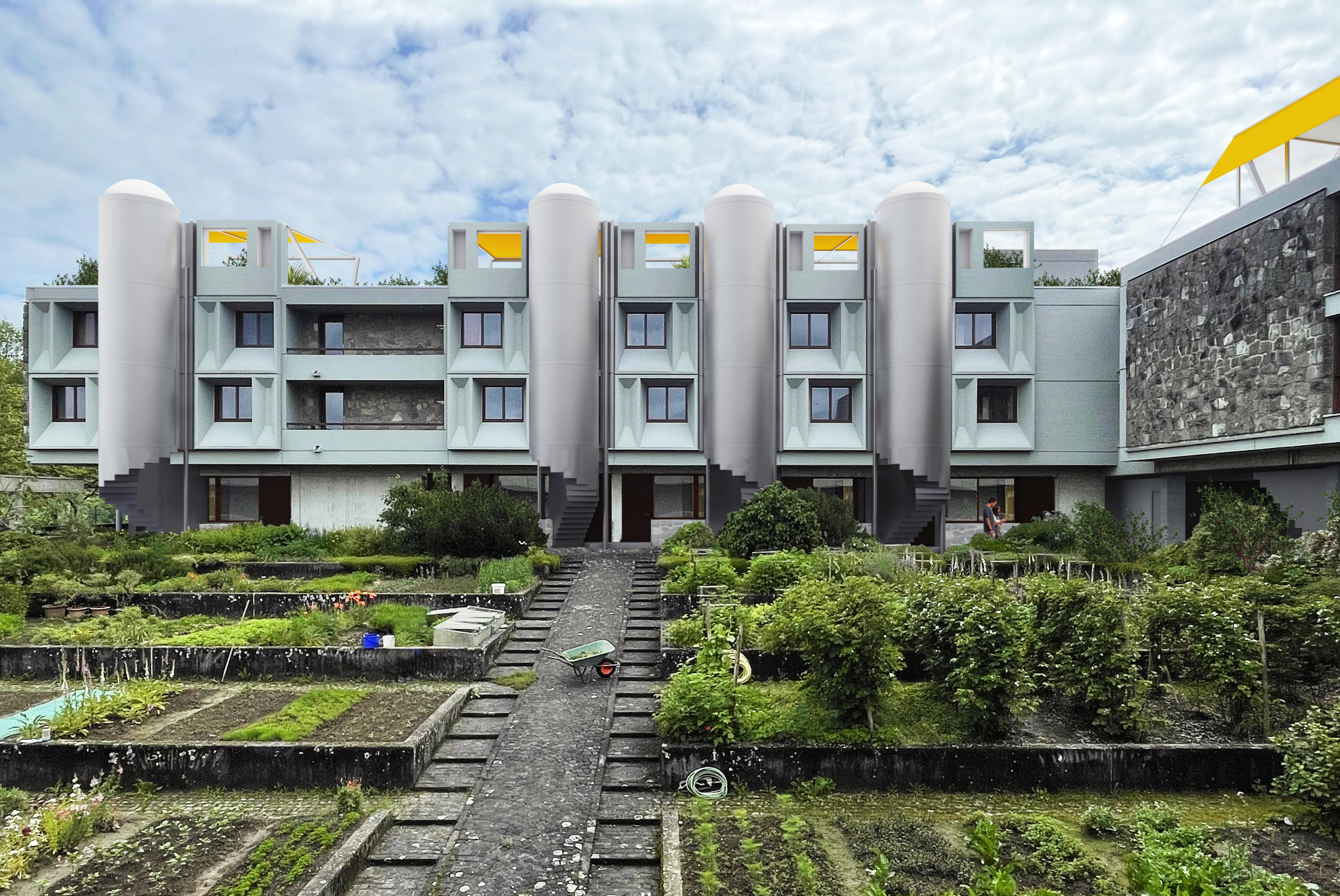 Die Schwestern des 1972 von Marcel Breuer entworfenen Klosters Baldegg kämpfen mit dem Rückgang ihrer Gemeinschaft, sodass ein Teil der Anlage für neue Nutzungen transformiert werden soll. Klimakrise und Bodenknappheit verlangen nach einem ressourcenschonenden, «enkeltauglichen Raumkonsum». Der Schweizer Wohntraum hingegen entwickelt sich in die entgegengesetzte Richtung: Die durchschnittliche Wohnfläche pro Person ist hoch und steigt weiter. Die Arbeit wagt einen Spagat zwischen diesen divergierenden Vorstellungen. Im Mutterhaus entstehen Wohnungen, die auf Qualitäten des Einfamilienhauses aufbauen. Der Flächenverbrauch pro Person liegt jedoch gerade einmal bei 25 m2. Sämtliche neue Installationen und Treppen finden in neuen Fassadenelementen Platz. Kapelle, Kapitelsaal und Speisesaal werden zum neuen Mikrozentrum mit Restaurant, Quartierladen, Hotelrezeption und anderem mehr.