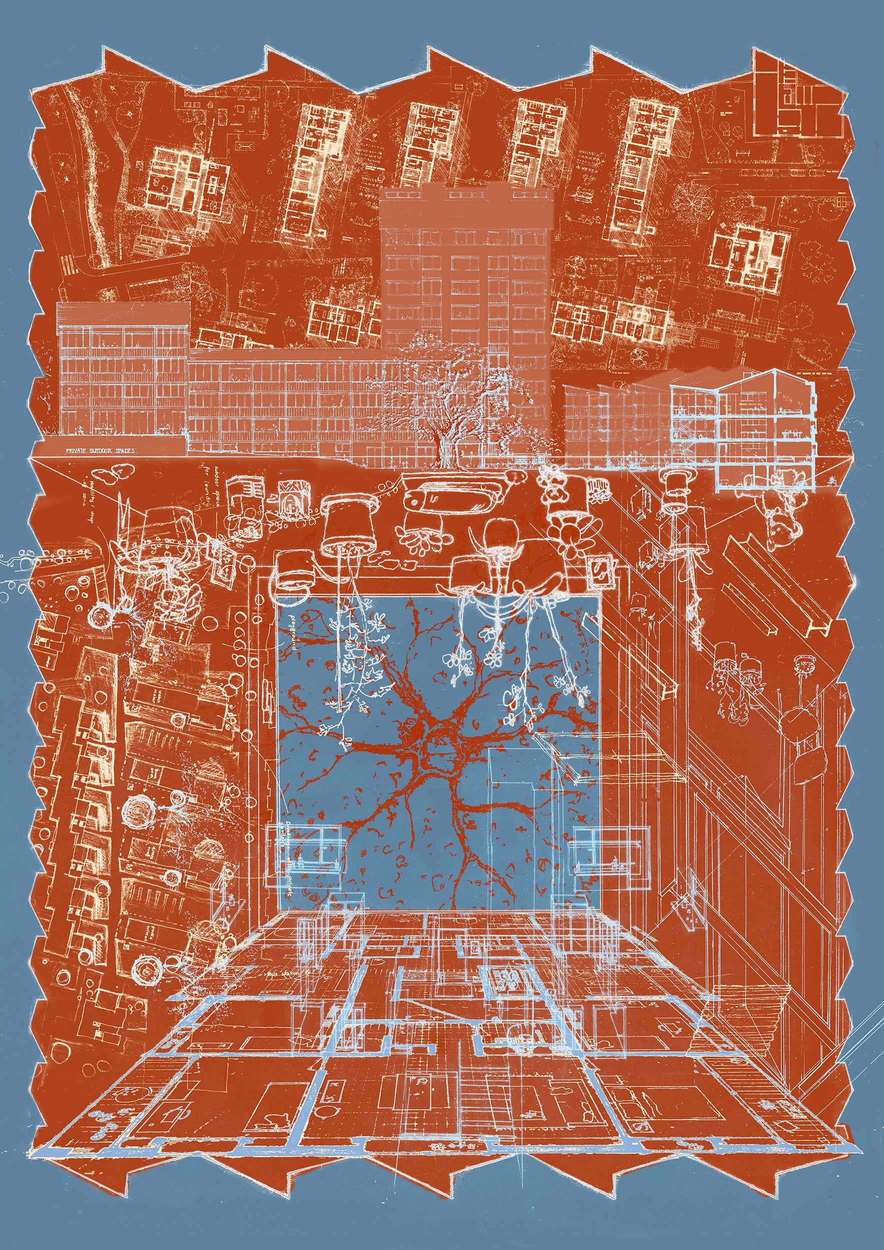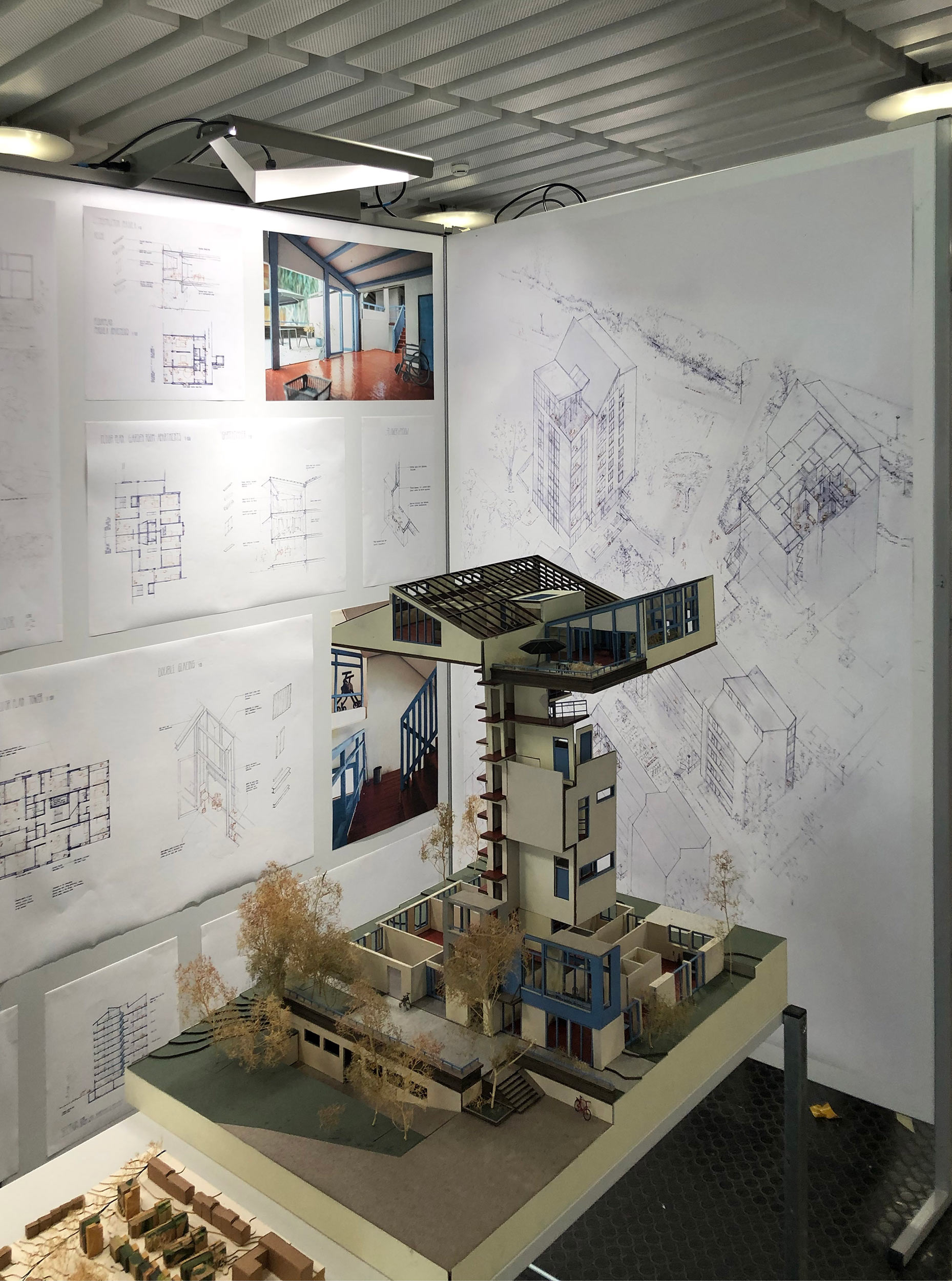 Das Ziel der Arbeit ist eine Aufwertung und Verdichtung des Bestandes sowie eine Neuorganisation der Grün- und Gemeinschaftsräume. Durch genau platzierte Volumen werden Erschliessungsprobleme gelöst, sowie mehr Raum für Wohnungen und Ateliers geschafft. Dabei werden die neuen Volumen aus wiederverwendeten Materialien aus Zürich gebaut.