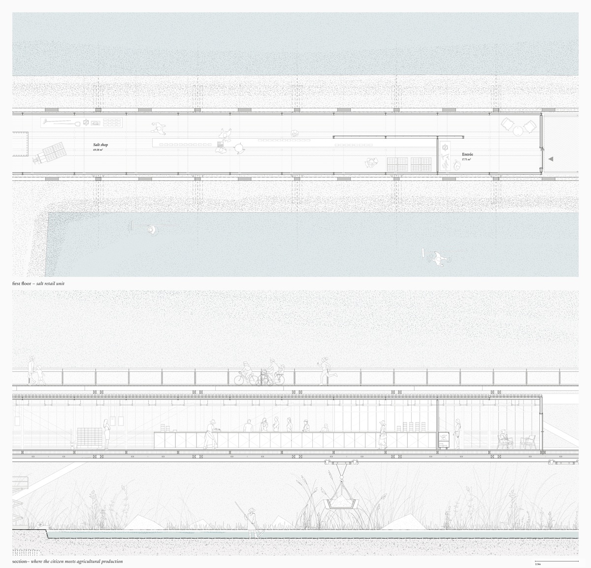 In Anlehnung an Christian Norberg-Schulz’ Idee vom Genius Loci geht es darum, den Geist des Ortes neu zu deuten und zu beleben. «Linha do Sal» ist eine lineare Infrastruktur, die ein 26 Hektar grosses Fragment der 360 Hektar umfassenden Salzlandschaft Alcochetes reaktiviert. Die Struktur orientiert sich an der Geometrie und Morphologie der Landschaft. Sie ist einerseits geradlinig und konstruktiv klar, andererseits bewusst fragmentiert und organisch in den Übergängen. Mineralische Fundamente tragen ein korrosionsresistentes Holzfachwerk aus metallarmen, reinen Holzverbindungen – robust, verankert und zugleich wandelbar in der Zeit. Als infrastruktureller Palimpsest ist das Projekt auf zeitliche Transformation angelegt: Heute dient es der kulturellen Reaktivierung, in naher Zukunft – mit steigendem Meeresspiegel – wird es als erhöhter Pfad durch überflutete Salinen fungieren. In ferner Zeit bleibt die mineralische Struktur als anthropomorphes Artefakt bestehen – ein stilles Zeugnis einer neu gedachten Salzkultur des 21. Jahrhunderts.